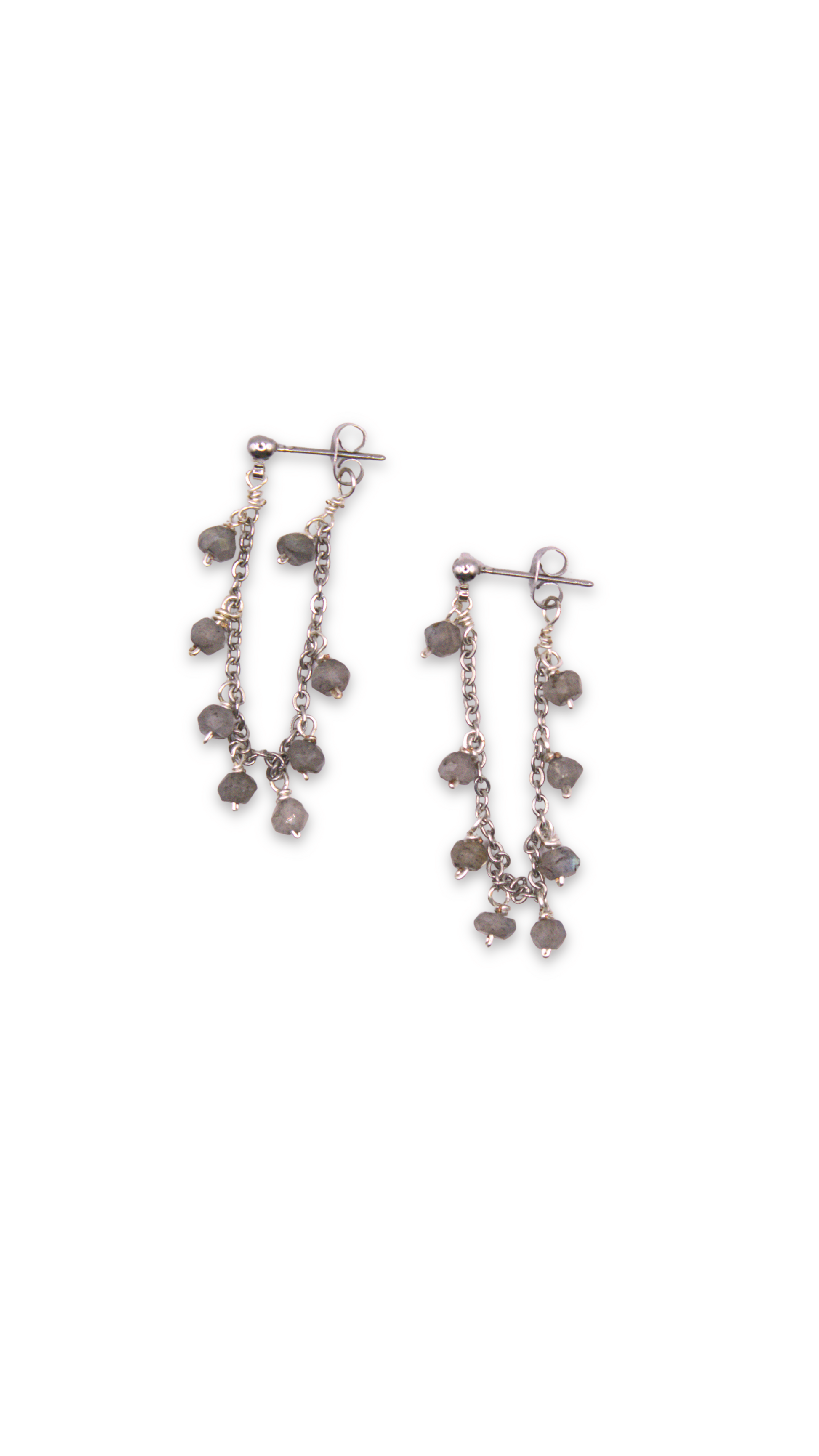 Materiales: aretes colgantes de chapa de oro de 18k con labradoritas facetadas.
