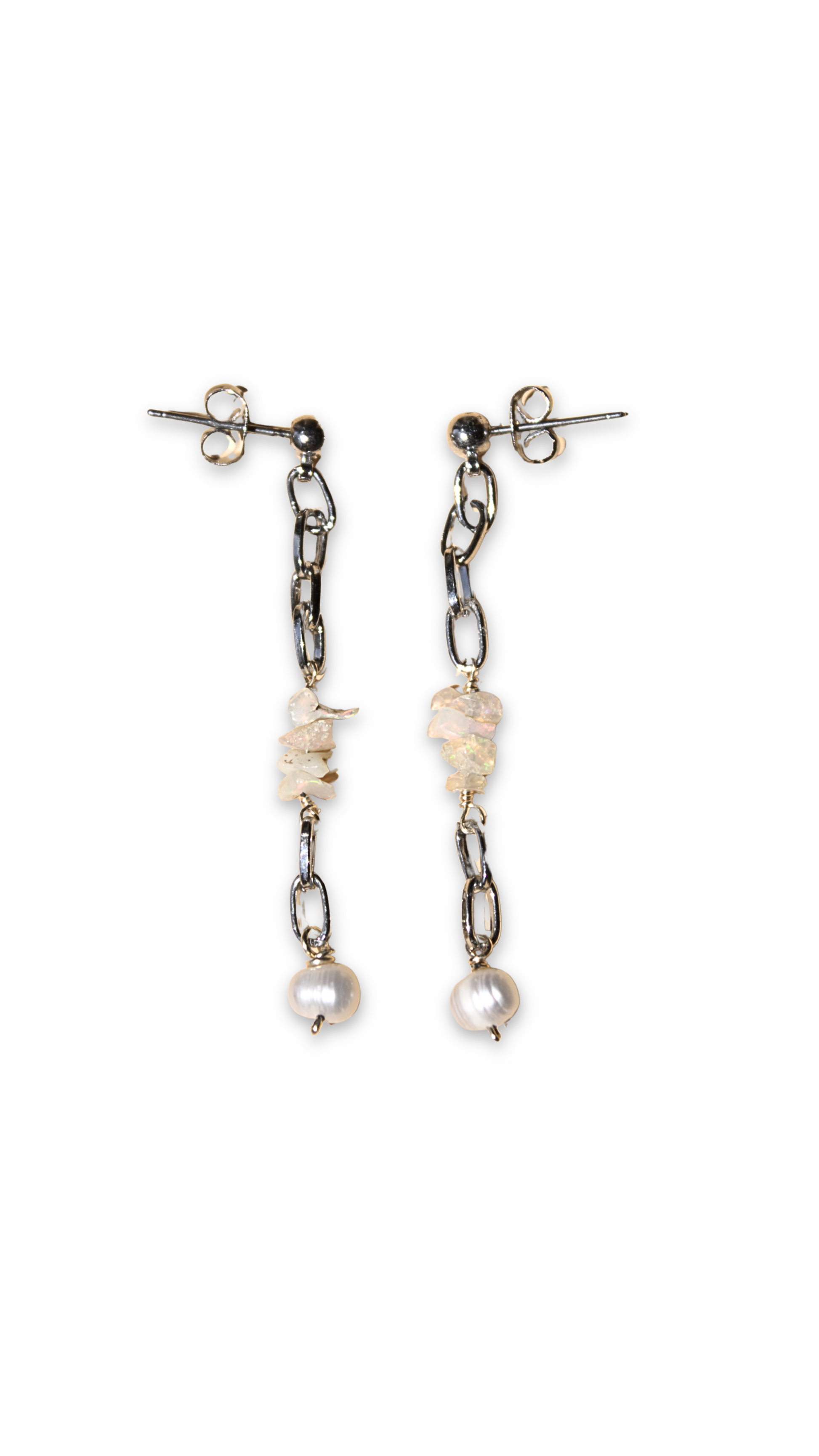 Materiales: Aretes plateados de rodio con alambre dorado resistente al desgaste y ópalos etíopes azules/blancos.