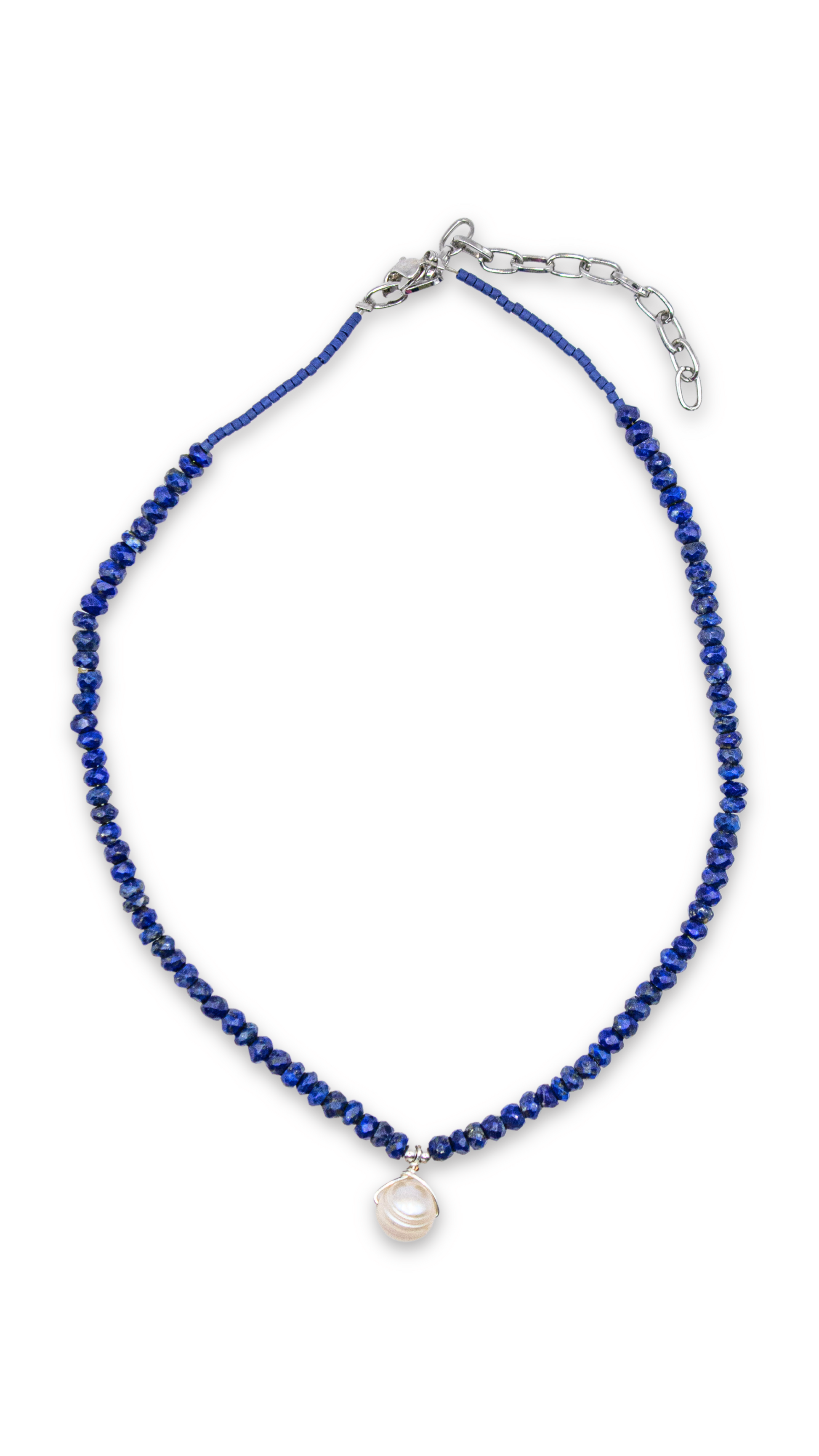 Materiales: collar de chapa de oro de 18k hecho con lapislázuli facetado, piedras miyuki azules y perla de río como colgante.