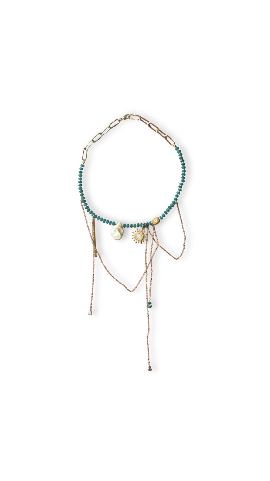 Collar con jade, con dijes y cadenas colgantes.
