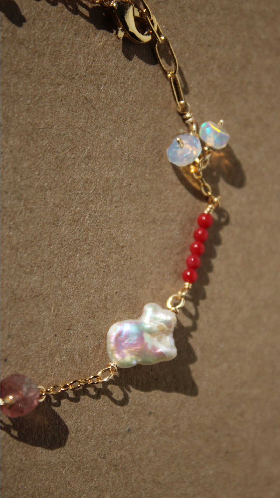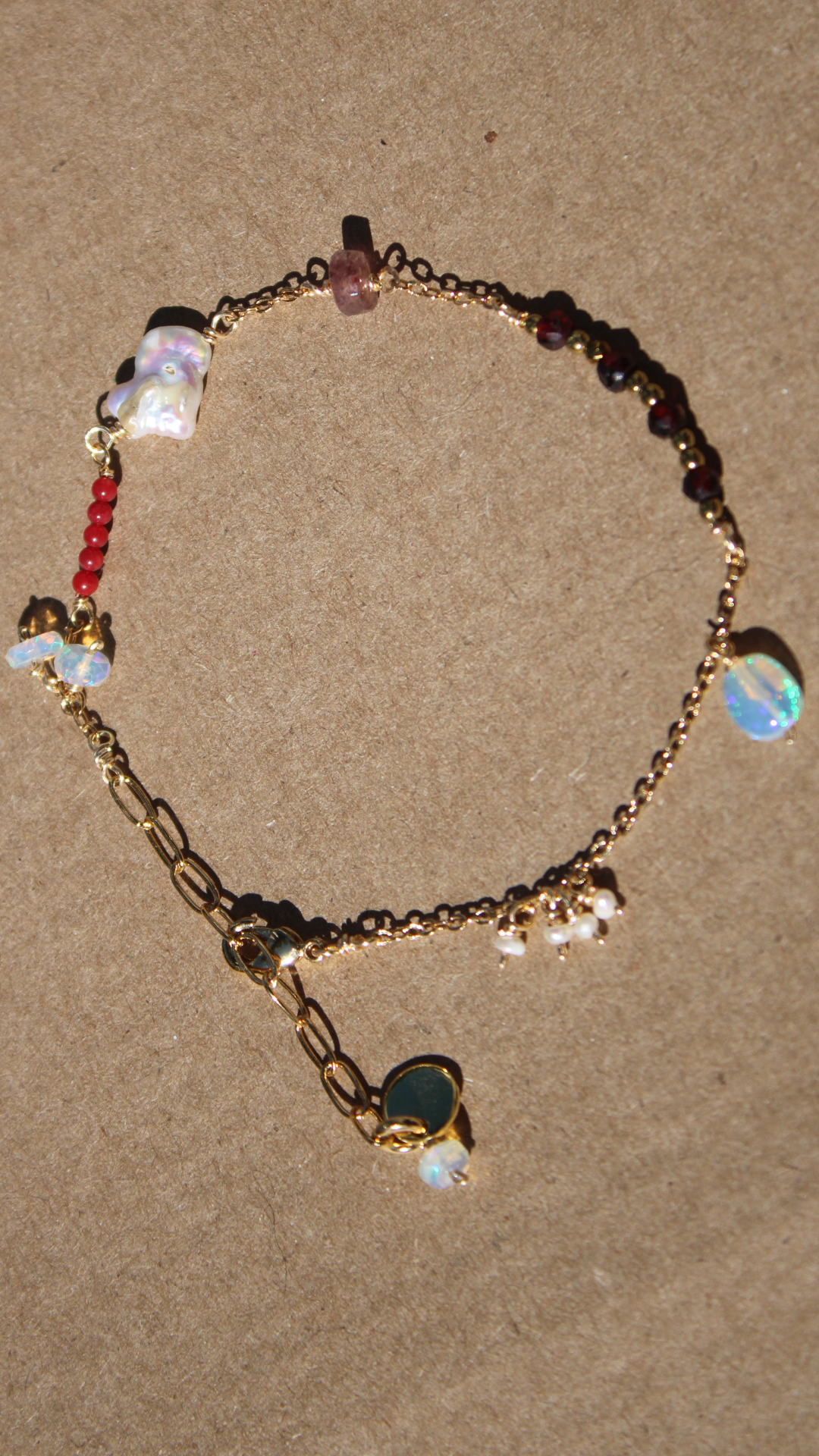 Materiales: delicada pulsera con variedad de piedras, perlas minúsculas, ópalo chip, ópalo rondel, corales esfera, granates, hematitas facetadas, cuarzo fresa, perla hojuela tornasol.